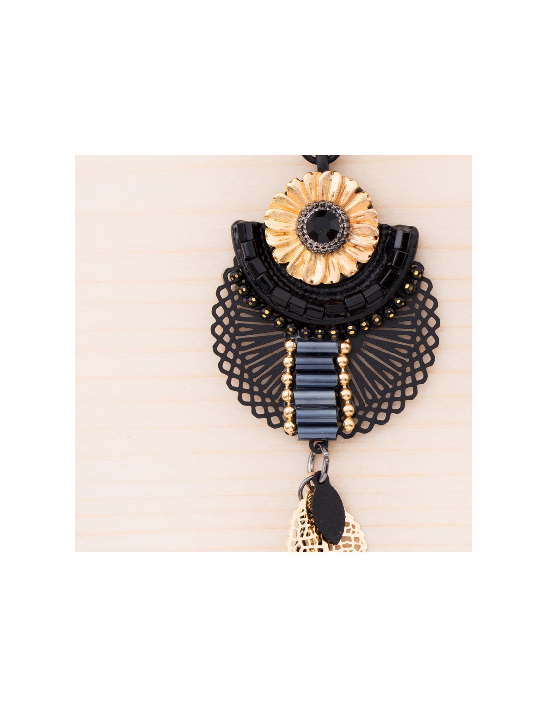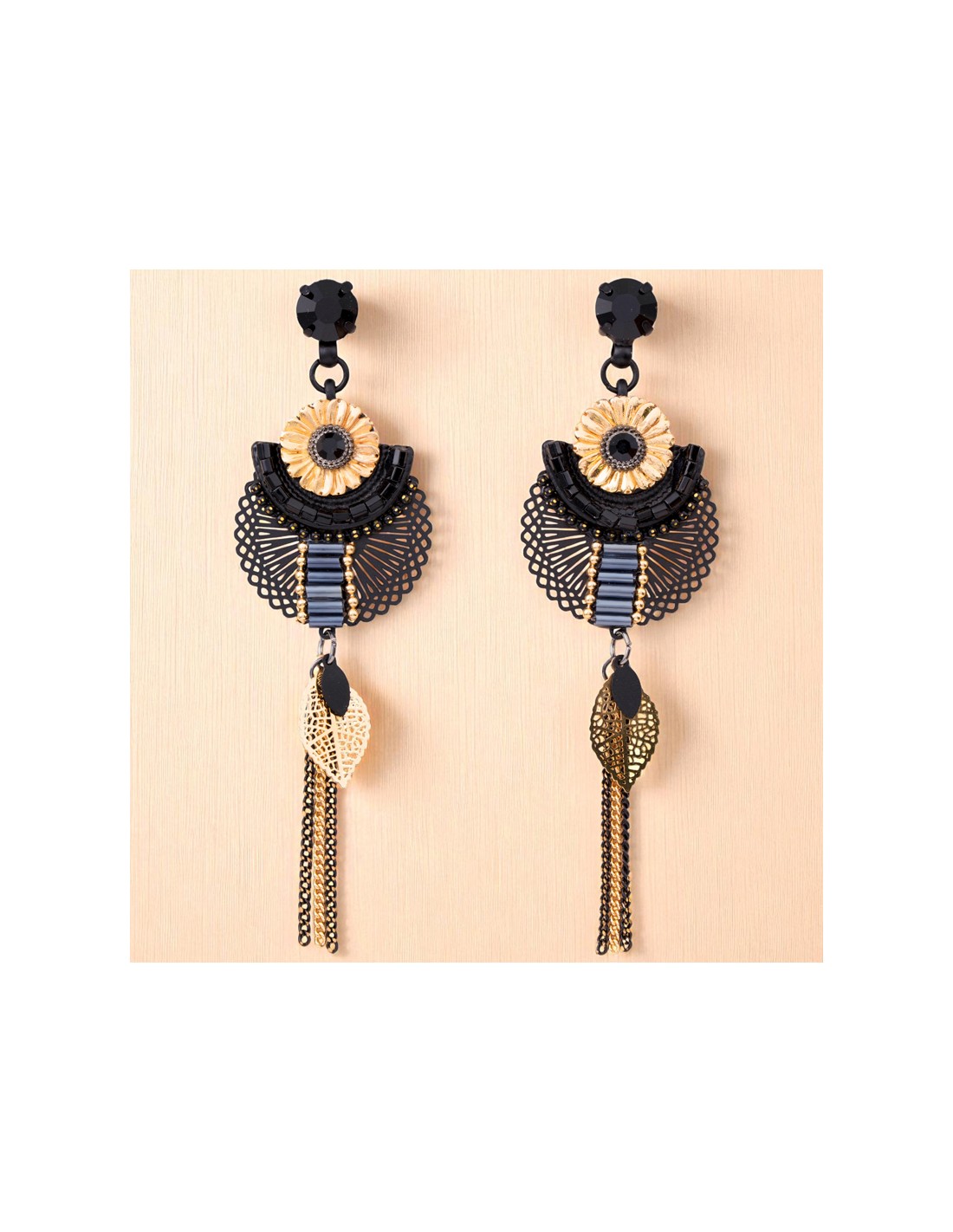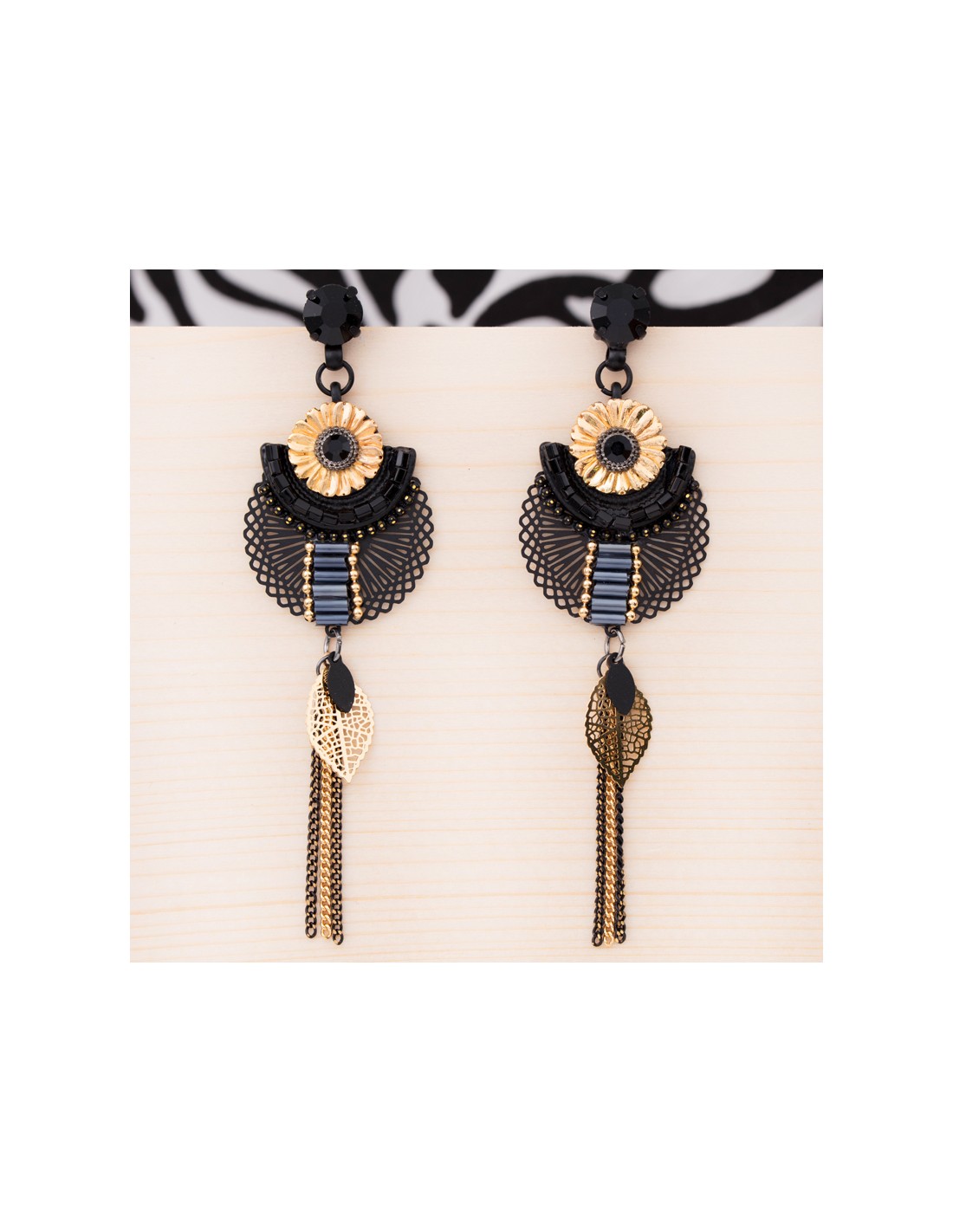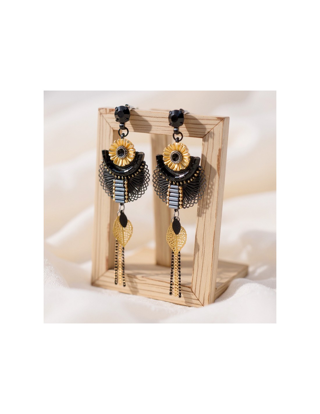 Boucles d'oreilles FLOR DE EGYPTA Black Gold Pendantes longues Floral filigrane Noir Doré à l'or fin Cristal