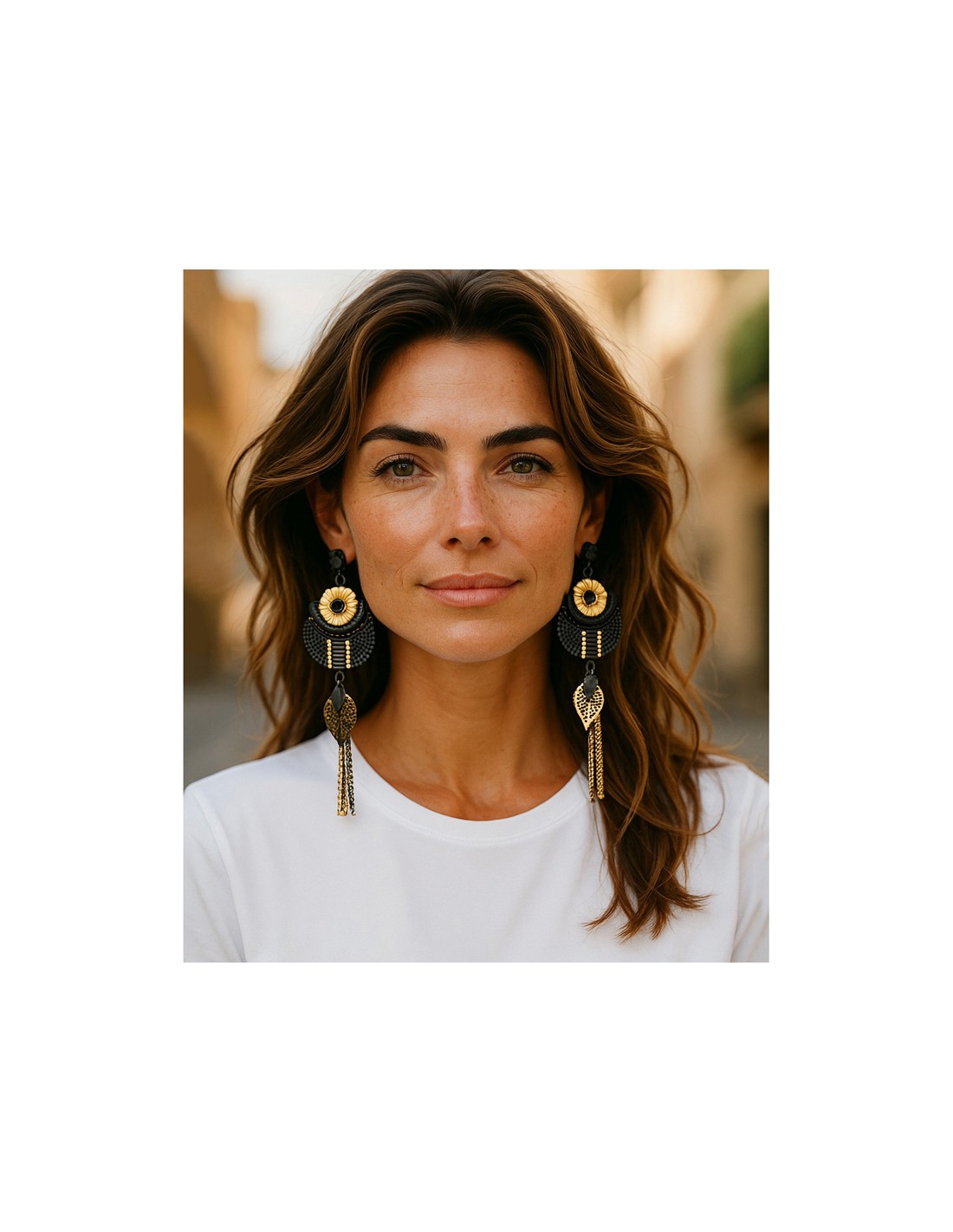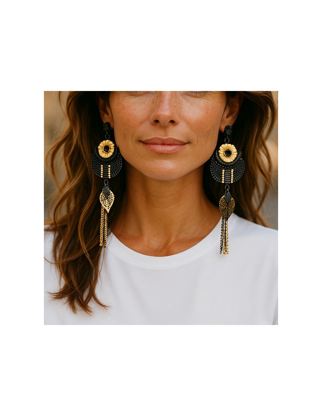 Boucles d'oreilles SOUANA Black Gold & Silver Pendantes ajourées Feuilles filigranes...