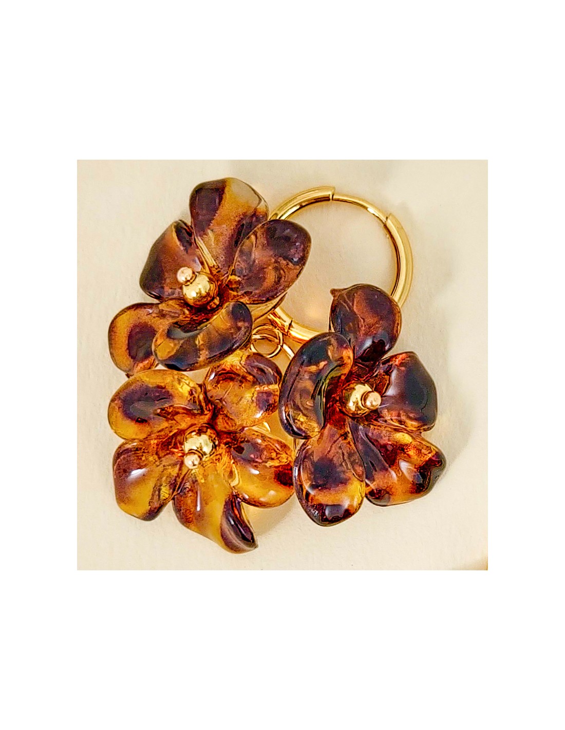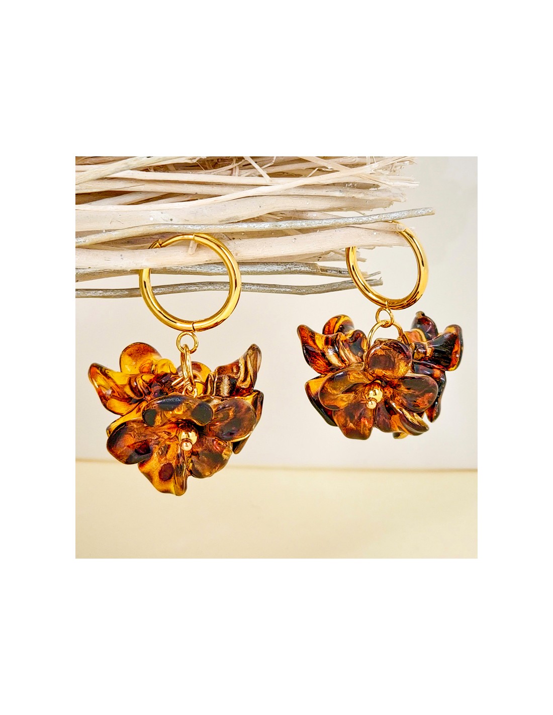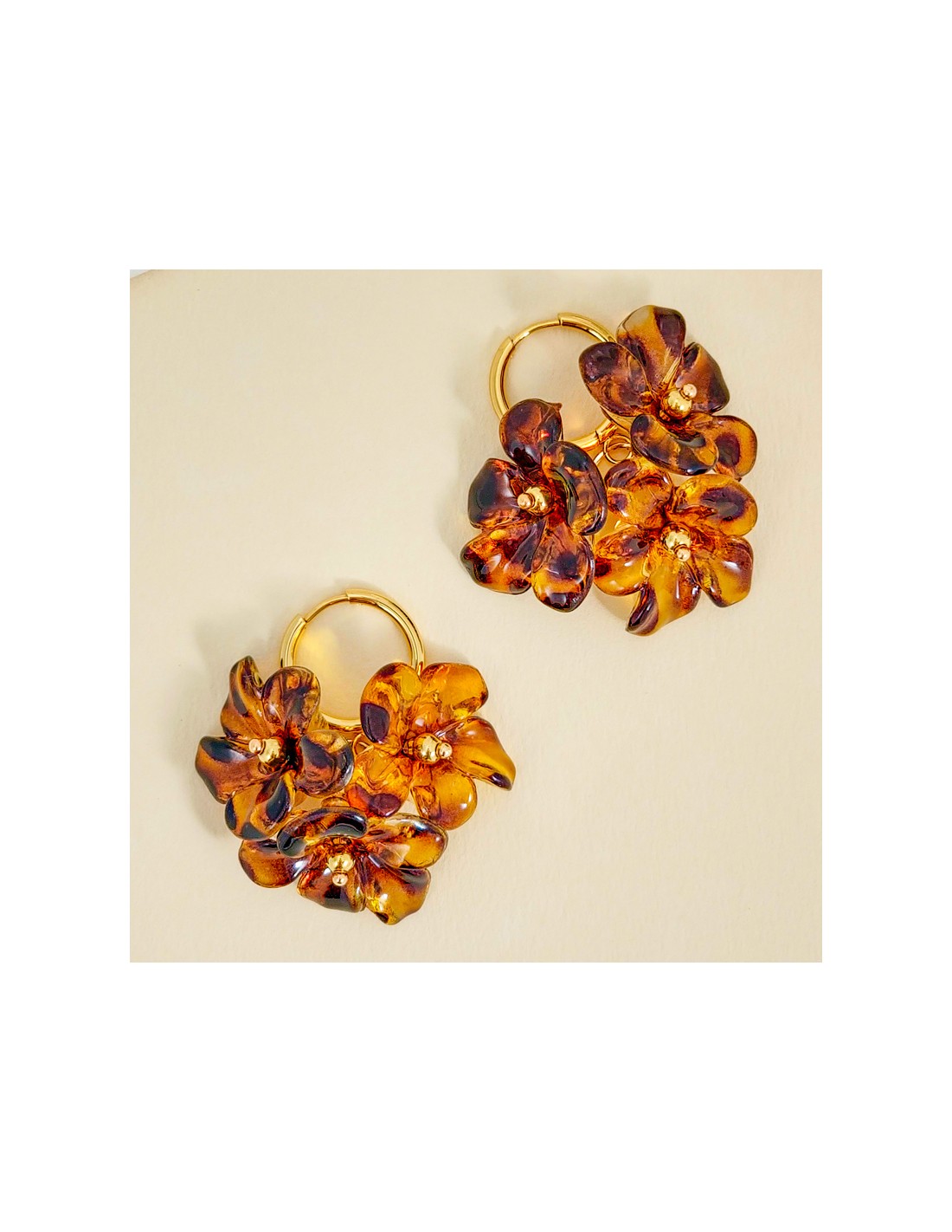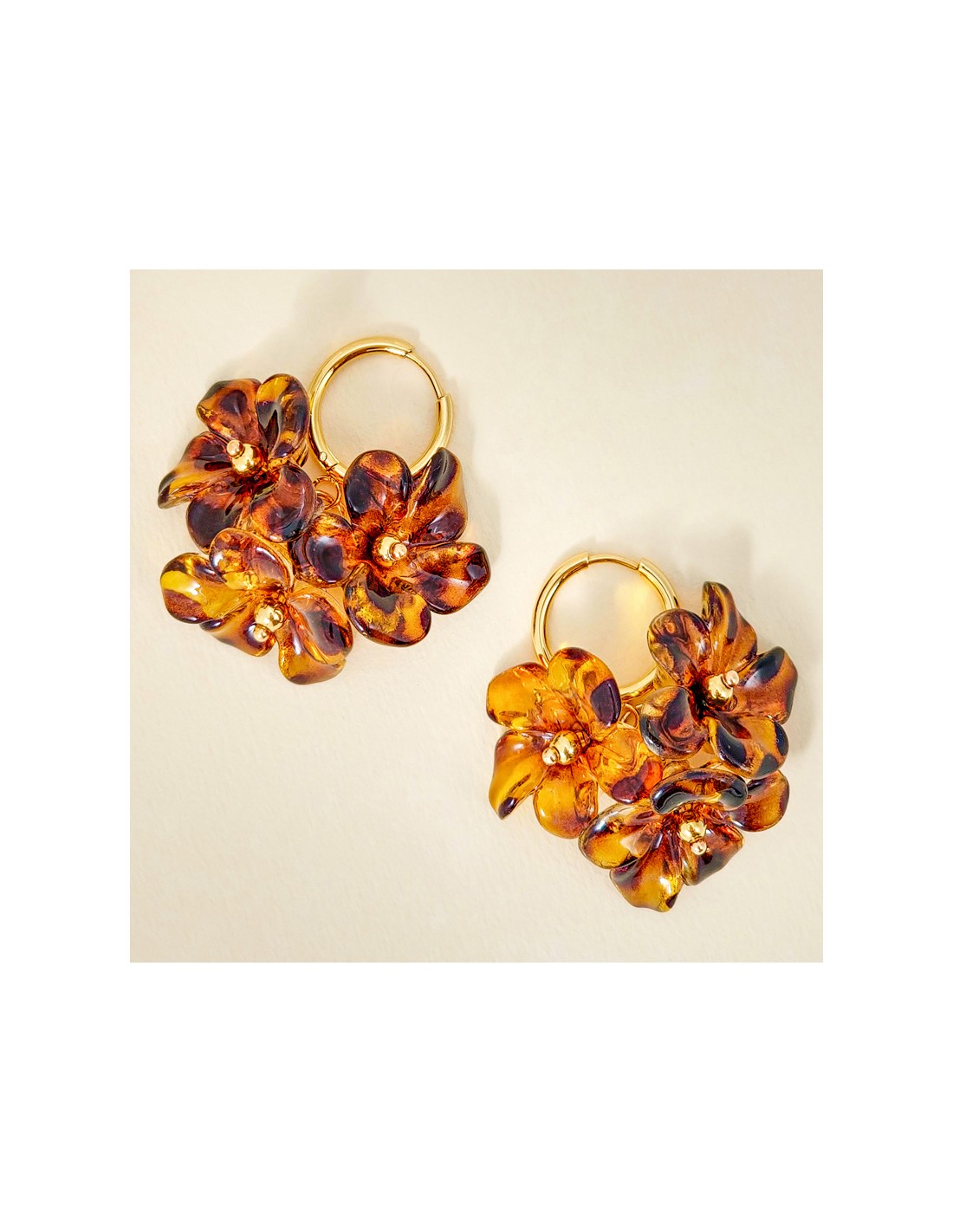 Boucles d'oreilles BLOSSOMS BOUQUET Brown Gold Créoles à pendentif Fleurs imprimé léopard Marron Acier inoxydable doré Résines
